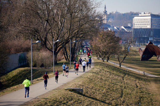 Wir starten gemeinsam beim Kunstmuseum Lentos Linz und laufen dann eine kleine Kurve hinunter zur Donau. Danach geht es entlang der Donau, unter der Neuen Eisenbahnbrücke durch bis kurz vor die Autobahnbrücke. Hier laufen wir auf den Damm hinauf und wieder retour zum Lentos. In die zweite, dritte, vierte, … Runde biegt ihr direkt vor dem Lentos ab.Eine Runde hat 2,5 Kilometer!5 Kilometer = 2 Runden