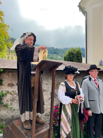 09:00 Uhr: Abmarsch beim Gemeindeamt - das Marktmandl wird zum Kirchenplatz gebracht und dabei von der Zech, der Tuschmusi und der Trachtengruppe Feld am See begleitet. Anschließend Begrüßung und Proklamation (gelesen von Marc Ofner) vor der Evangelischen Kirche bei der Lutherrose