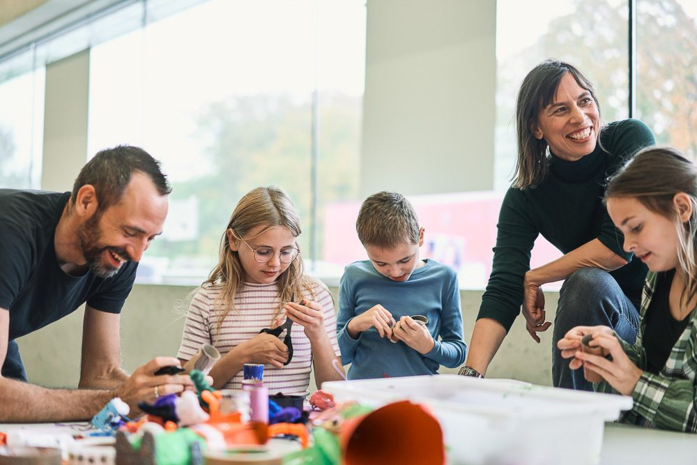 Jedes Mal kann eine ande­re künst­le­ri­sche Metho­de erprobt wer­den: Von groß­flä­chi­gen Mal­ak­tio­nen, bis zu fei­nen medi­ta­ti­ven Lini­en, von Faden­ver­stri­ckun­gen und Stoff­col­la­gen, Schat­ten­spie­len und Expe­ri­men­ten mit Skul­pu­ren oder Druck­ver­fah­ren. Die ange­bo­te­nen künst­le­ri­schen Metho­den sind von den jewei­li­gen Aus­stel­lun­gen und Künstler*innen im Muse­um inspi­riert. Jedes Ate­lier beinhal­tet auch einen gemein­sa­men, krea­ti­ven Besuch in der Ausstellung.