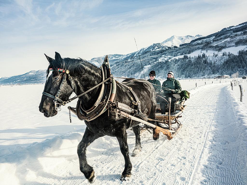 Verschneite Winterlandschaften, schnaubende Pferde und das sanfte Glockengebimmel – Pferdeschlittenfahren in Piesendorf gehört einfach zum Winter dazu. Eingehüllt in warme Decken genießen Gäste die Ruhe der Natur und erleben den Winter von seiner schönsten Seite.