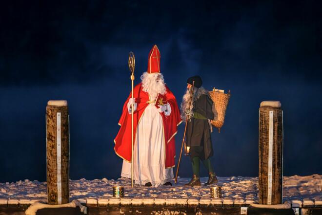 Das leise Plätschern des Sees lässt die Spannung und Vorfreude bei den Kindern steigen, bis endlich die Fuhr mit dem Nikolaus langsam aus der Dunkelheit der Nacht heraustritt und das Ufer des Sees erreicht.