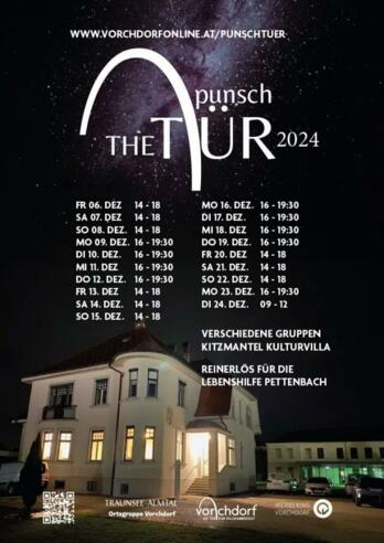 Geöffnet hat die PunschTÜR täglich ab 13. Dezember bis 23. Dezember. Die Öffnungszeiten sind an Wochentagen 16 bis 19:30 Uhr, an Samstagen und Sonntagen 14 bis 18 Uhr.