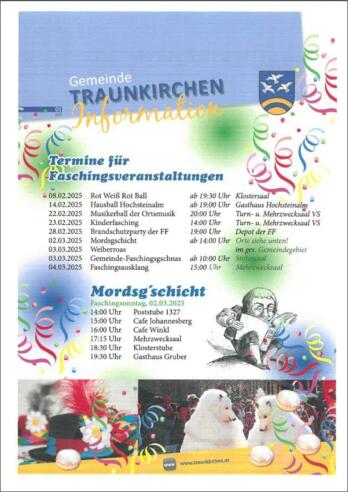 Traunkirchner Faschingsausklang mit Seiterbar, Gardebar, Spritzerbar, Kesselheiße und Kinderdisco