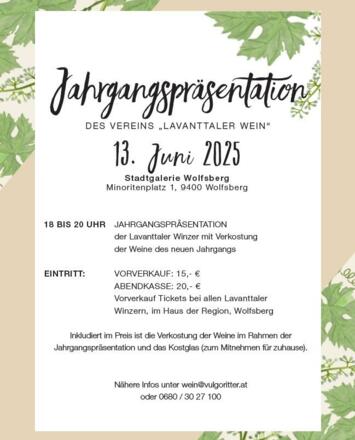 Die Lavanttaler Winzer laden herzlich zur jährlichen Weinpräsentation ein – und dieses Jahr dürfen wir erstmals in die wunderschöne Stadtgalerie Wolfsberg einladen!