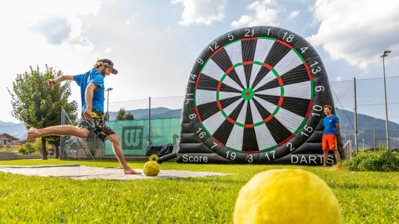 Foot Darts - Bei diesem Spaß für die ganze Familie bauen wir eine vier Meter hohe Dartscheibe auf, auf die mit Fußbällen geschossen wird. Die Fußbälle sowie die Dartscheibe sind mit einem Klettverschluss überzogen, sodass die Bälle darauf haften.
