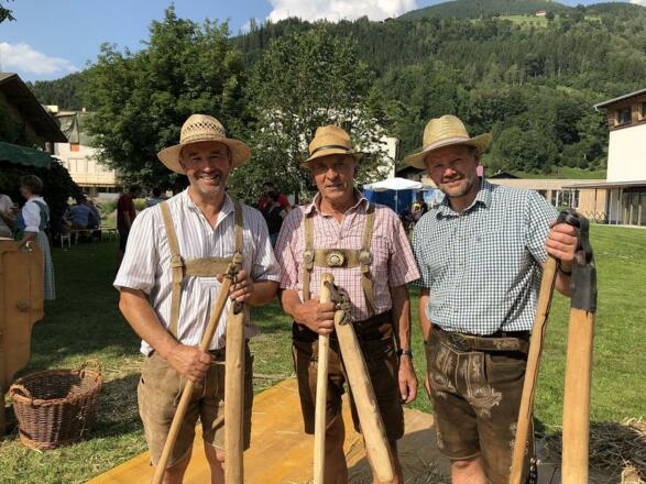 ca. 15:00 Uhr: Beginn des Festzuges mit Eintreffen der liebevoll aufgekranzten Kühe, des Stiegl Pferdewagens, der Droat Drescher, der Oldtimer Traktoren des "Oldtimer Club Gries" und der St. Georgner Schnalzer