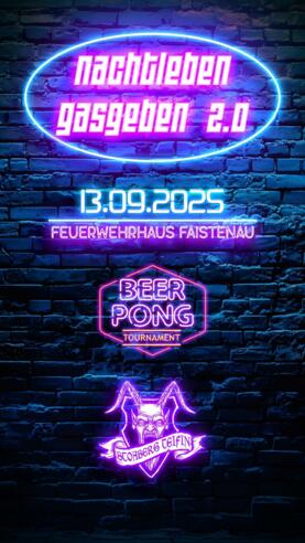 Die Stoaberg Teifin aus Faistenau veranstalten heuer zum zweiten Mal eine Party unter dem Motto "Nachtleben Gasgeben", mit Beerpong Turnier. Im Feuerwehrhaus Faistenau.