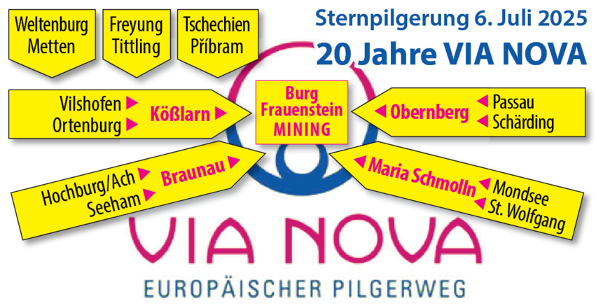 Pilgerfest am 6. Juli 2025 in Burg Frauenstein in Mining/OÖ.„Gemeinsam unterwegs für Frieden und Hoffnung“🥾 Ab 13:00 Uhr Bewirtung und Musik (Bläser Ensemble Mining)🥾 14:00 Uhr Eintreffen der Sternpilgergruppen mit Musik und Empfang🥾 15:00 Uhr Ökumenischer Gottesdienst🥾 16:00 Uhr Festakt mit Grußworten und Rede der Stellv. Obfrau🥾 Geselliges Beisammensein mit Musik