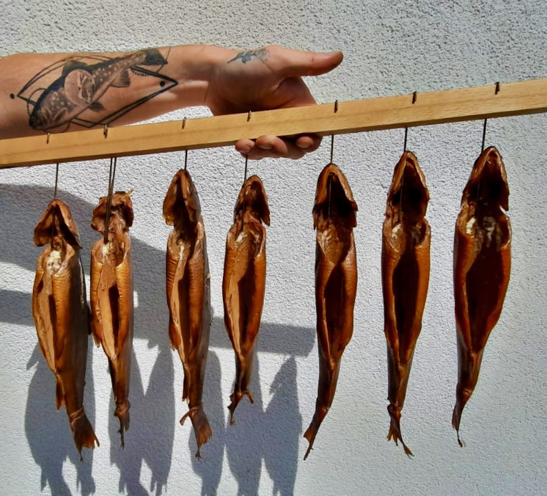 In einem von Max und seinen Vater gemeinsam geschmiedeten und gebauten Räucherkasten werden die Fische nach altem Familienrezept - es stammt vom Urgroßvater - von Hand eingesurten Saiblinge aus den nahegelegenen Seen von Max sorgsam mit hoher Kunstfertigkeit und einer guten Portion Erfahrung, in heißem Erlenrauch zu einer wahren Köstlichkeit veredelt. Golden glänzend und würzig duftend ein ganz besoderer Genuß.