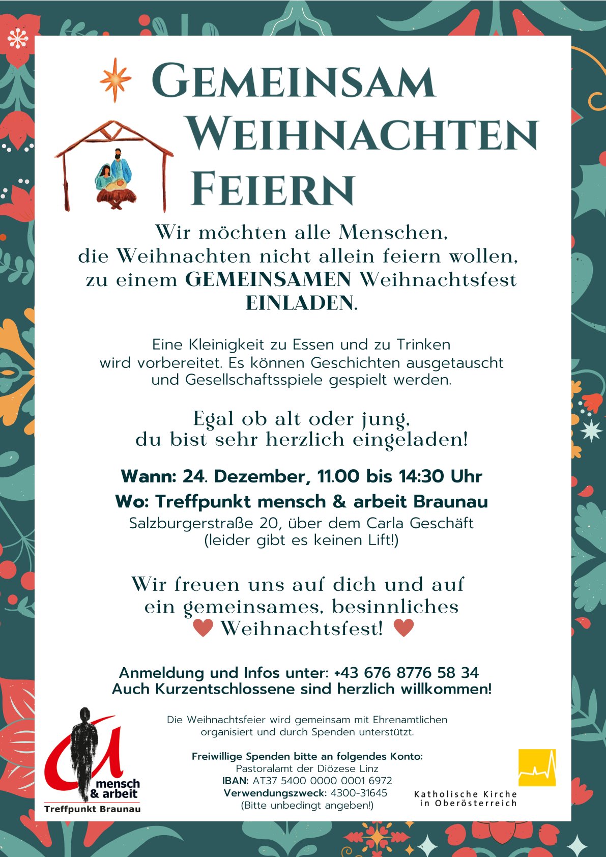 Wir möchten alle Menschen, die Weihnachten nicht allein feiern wollen, zu einem GEMEINSAMEN Weihnachtsfest EINLADEN.