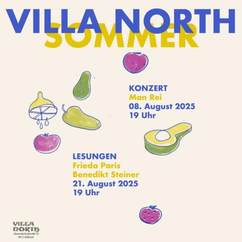 Herzliche Einladung am 8. August um 19 Uhr zum Konzert von Man Rei sowie am 21. August um 19 Uhr zum Lesungsabend mit Frieda Paris und Benedikt Steiner im Garten der Villa North.
