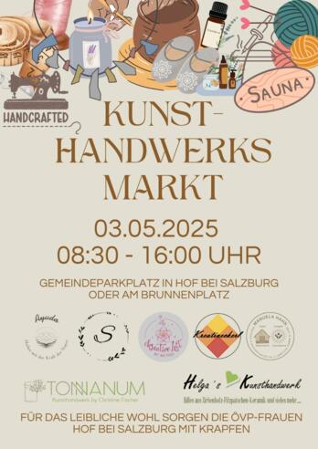 Produkte regionaler Anbieter am Gemeindeparkplatz oder Brunnenplatz, Verköstigung via ÖVP Frauen: frische Bauernkrapfen