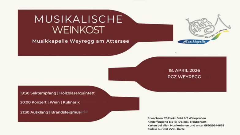 Die Musikkapelle Weyregg lädt wieder zu einer "musikalischen Weinkost" ein. Ein bunt gemischter Reigen mit bodenständigen aber auch modernen Musikstücken aus Österreich und aus dem Ausland erwartet die Zuhörer. Freuen Sie sich auf ein wunderbares Konzert mit kulinarischen Genüssen.