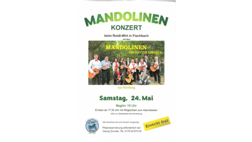 Am Samstag, 24. Mai laden die Fish-Biker`s zu einem Mandolinen-Konzert mit dem Orchester "Girgner" im Gasthaus Roidl in Fischbach ein. Der Eintritt ist frei. Beginn ist um 19:00 Uhr; Einlass ab 17:30 Uhr mit Möglichkeit zum Abendessen. Infos zur Speisekarte bei Anmeldung. Alle Musikfreunde sind herzlich eingeladen.Platzreservierung erforderlich bei Georg Dvorak Tel. 0170 8157418