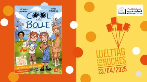 Die Marktbücherei verschenkt am Welttag des Buches am 23. April 2025 die Broschüre "Cool wie Bolle" von Thomas Winkler und Timo Grubing. Dazu wird im Mai eine Bücherrallye mit fünf Stationen in der Kinderabteilung angeboten.