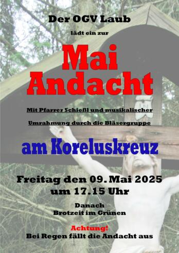 Die Maiandacht wird von Pfarrer Schießl am Koreluskreuz gehalten und musikalisch von einer Bläsergruppe umrahmt. Anschließend gibt es eine Brotzeit im Grünen.