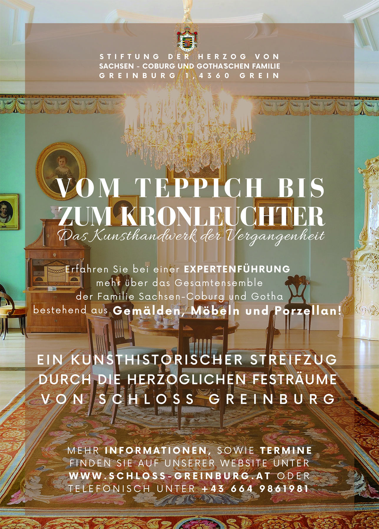 Die prachtvoll ausgestatteten herzoglichen Festräume der Familie Sachsen-Coburg und Gotha beherbergen Kunstgegenstände aller Art. Gemälde, Möbel und Porzellan bilden ein Gesamtensemble, welches aus kunsthistorischer Sicht betrachtet wird. Einzelne Gegenstände werden im Zuge dieser Führung hervorgehoben und somit wird vom Teppich bis zum Kronleuchter ein Streifzug in das Kunsthandwerk der Vergangenheit gemacht.