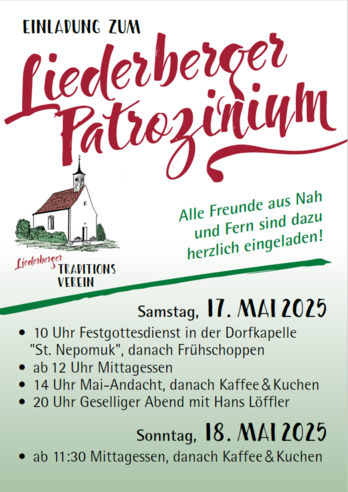 Alle Freunde aus Nah und Fern sind herzlich eingeladen zumLiederberger PatroziniumSamstag, 17. Mai 2025 ab 10:00 Uhr undSonntag, 18. Mai 2025 ab 11:30 UhrIhr Liederberger Traditionsverein
