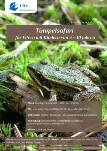 Gemeinsam mit unserem Umweltbildner Dr. Martin Lehmann der LBV-Kreisgruppe Fürstenfeldbruck erforschen wir, was sich im, auf oder über dem Wasser bewegt.Ort: Jesenwang, Bauschuttdeponie, Fürstenfeldbrucker StraßeZeit: 14:00 Uhr – ca. 15:30 UhrMitbringen: Kescher, Becherlupe (falls vorhanden) und GummistiefelKosten: 4,50 € pro PersonAnmeldung: umweltbildung.fuerstenfeldbruck@lbv.de (max. 20 Teilnehmende)