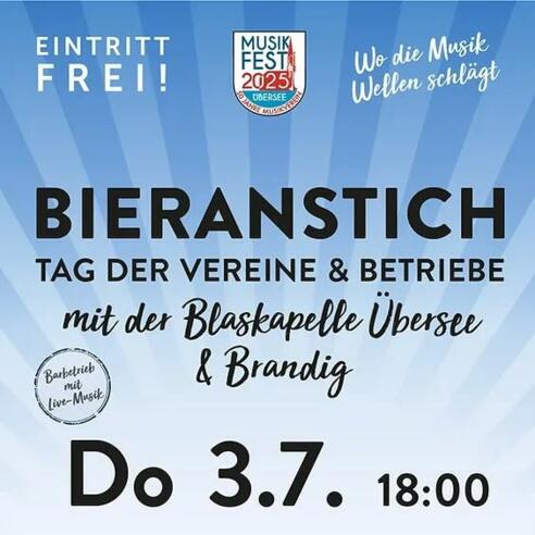 Am Donnerstag, 3. Juli 2025 findet ein traditioneller Bieranstich mit bestem Augustiner Fassbier im Festzelt Moosen statt. Vereine, Firmen und alle Überseer Bürger sind herzlich zu diesem Tag der Vereine & Betriebe eingeladen. Die Blaskapelle Übersee eröffnet ab 19 Uhr musikalisch den Abend. Ab ca. 21:30 Uhr wird BRANDIG aus Bayern für Stimmung sorgen. Das Barzelt öffnet um 22:00 Uhr, dort spielen THE DIBSS. Der Eintritt ist frei!