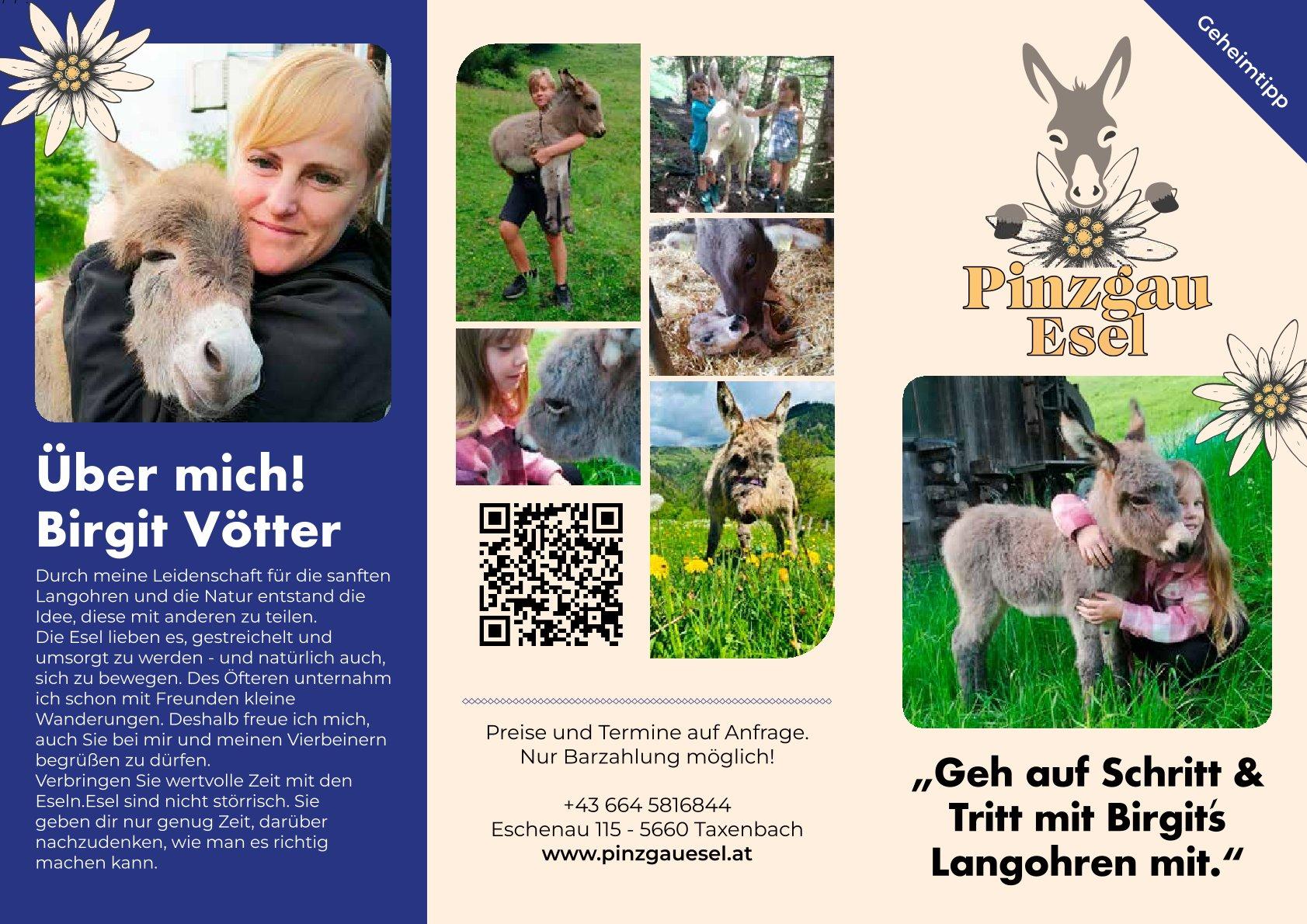 Geh auf Schritt & Tritt mit Birgit's Langohren mit. Vertrauen aufbauen, streicheln und striegeln. Anschließend kleiner Spaziergang. Schwierigkeit: Leicht, normales Schuhwerk & Wetterangepasste Kleidung. Anmeldung: bis Donnerstag 12 Uhr unter info@taxenbach.at oder unter +43 664 5816844, Kosten: 5 € mit der Gästekarte, ohne Gästekarte 10 € !familienfreundlich!