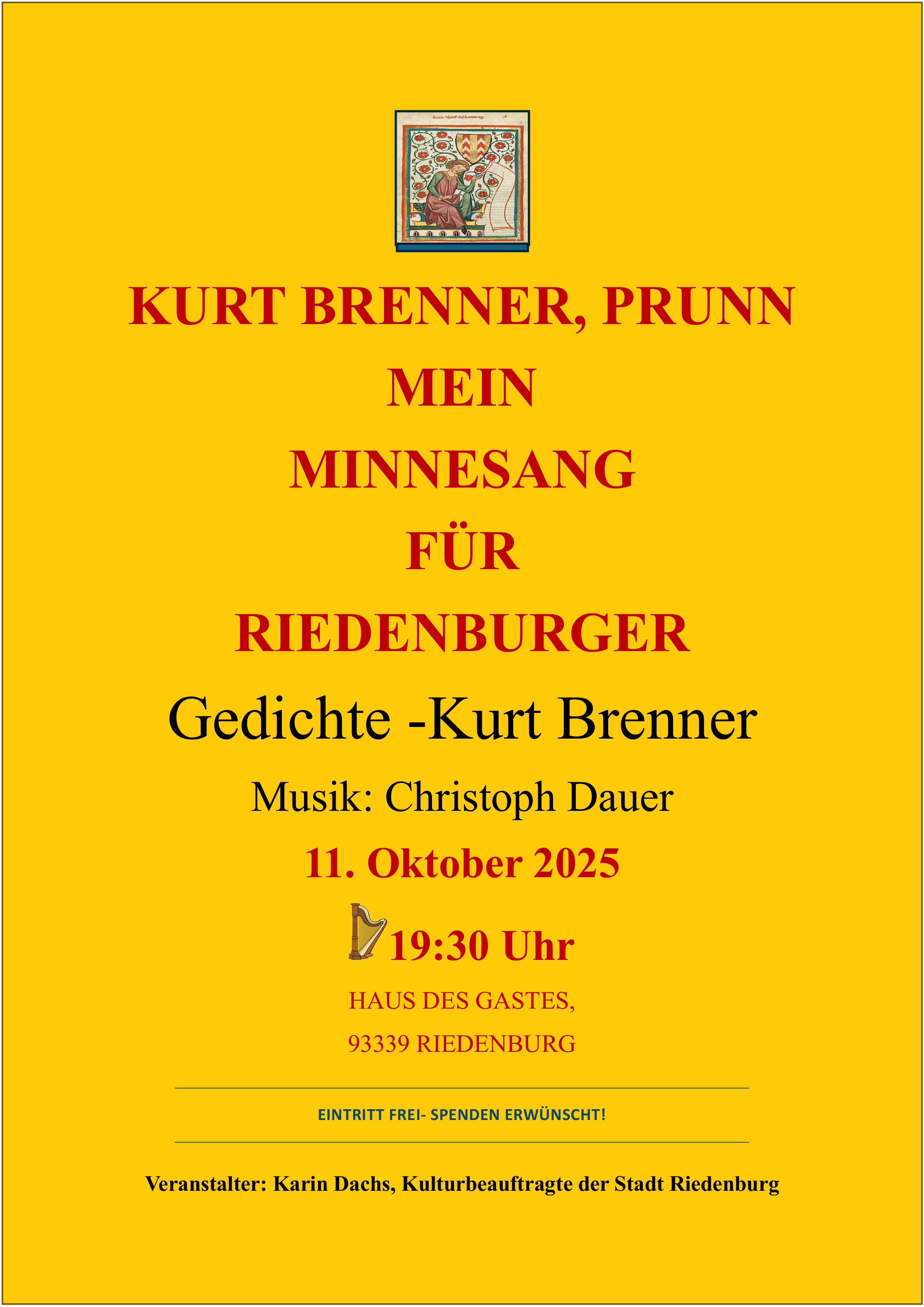 Prof. Dr. Brenner wird dabei eine Auswahl seiner Riedenburger Texte und Gedichte vortragen, musikalisch begleitet von Harfenmusik.Der betagte Autor Kurt Brenner reimt seit seiner Schulzeit Verse – meist über Personen seines Umfelds und zu besonderen Anlässen. Seit fünfzig Jahren widmet er sich auch Riedenburgerinnen und Riedenburgern, von denen viele inzwischen bereits verstorben sind.Ein literarisch-musikalischer Abend besonders für Seniorinnen und Senioren.