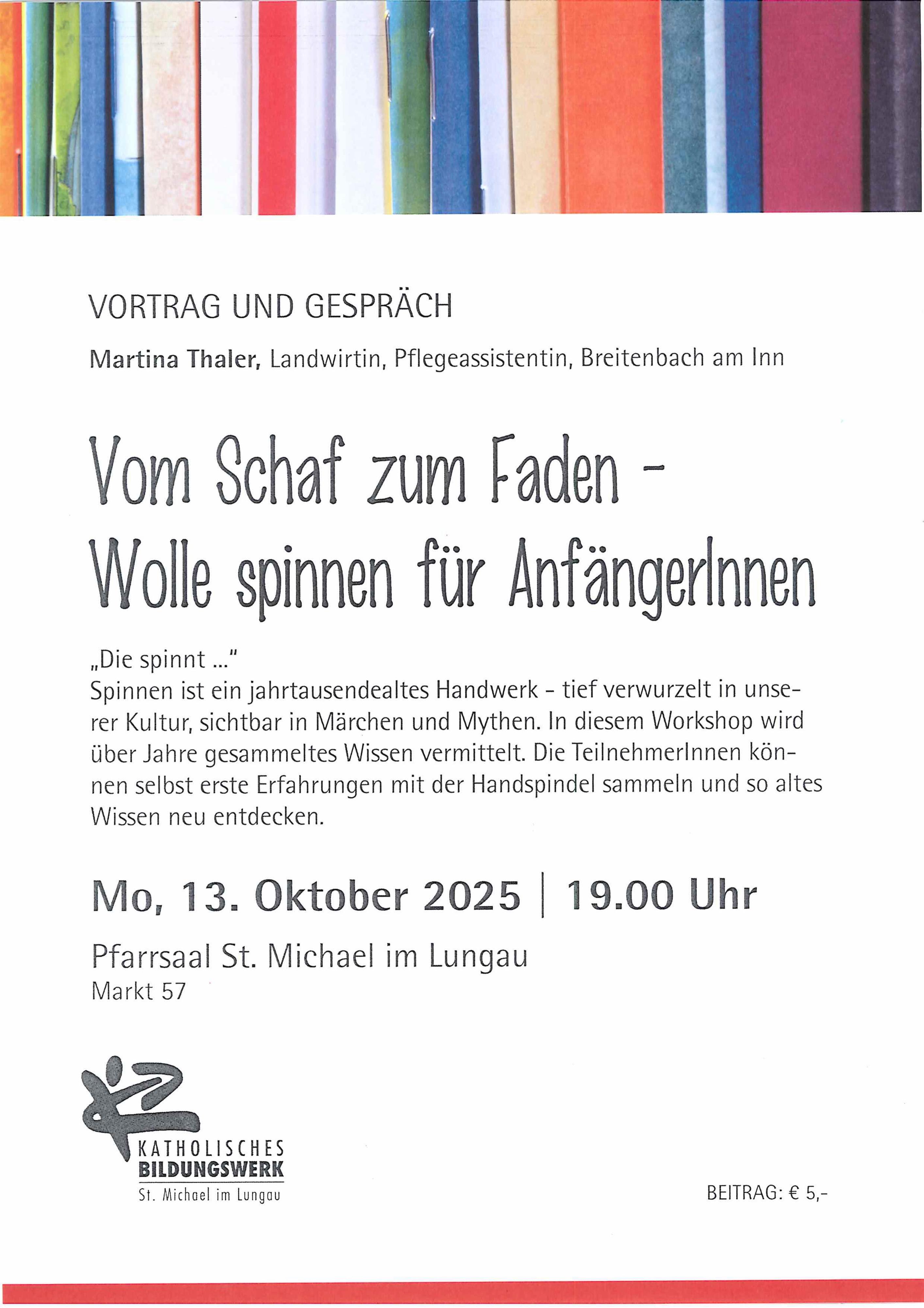 Vortrag und Gespräch von Martina Thaler, Landwirtin, Pflegeassistentin, Breitenbach am Inn: Vom Schaf zum Faden – Wolle spinnen für AnfängerInnen