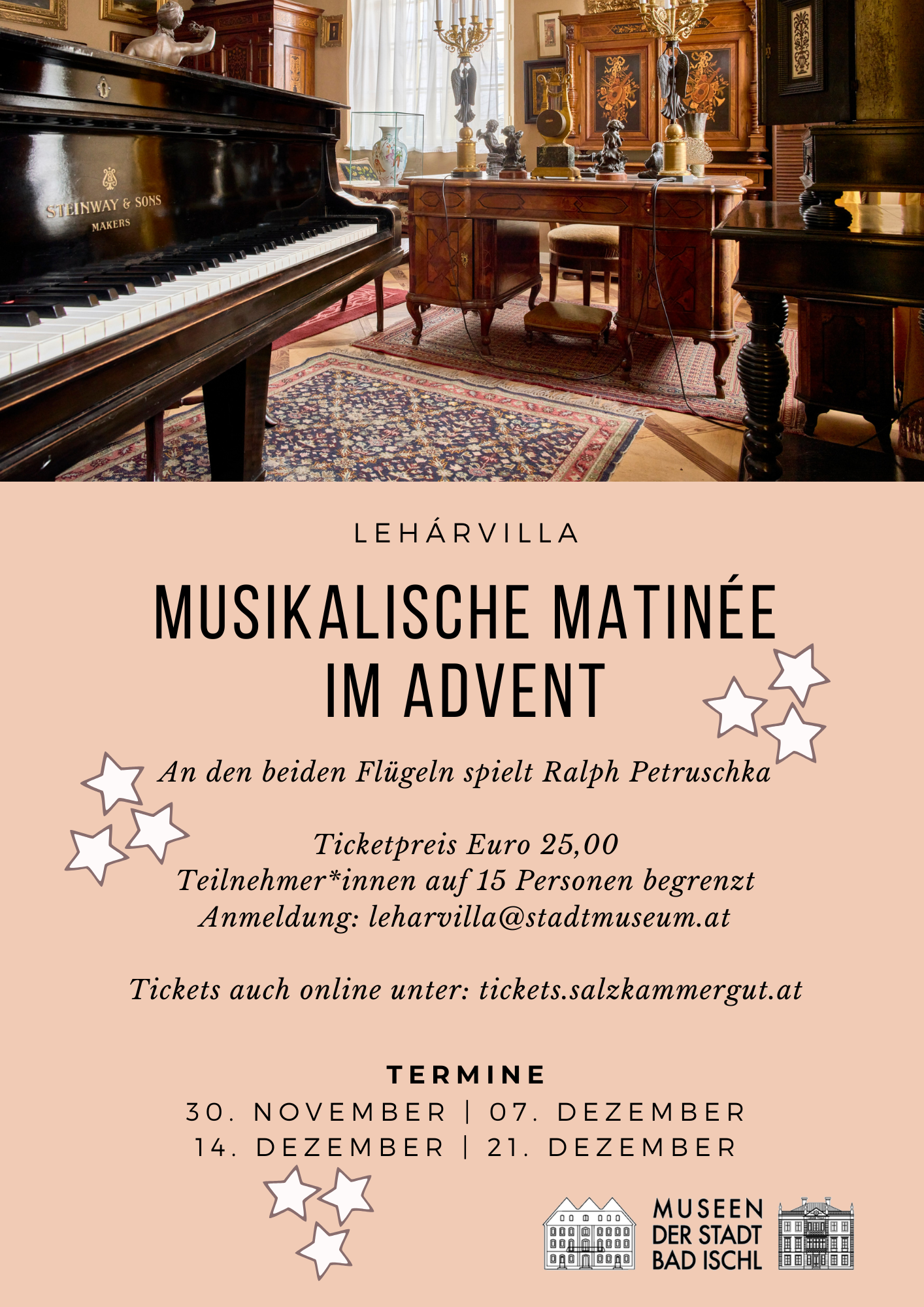 An den 4 Adventsonntagen findet jeweils um 10:30 Uhr eine Musikalische Matinée in der Lehárvilla statt.