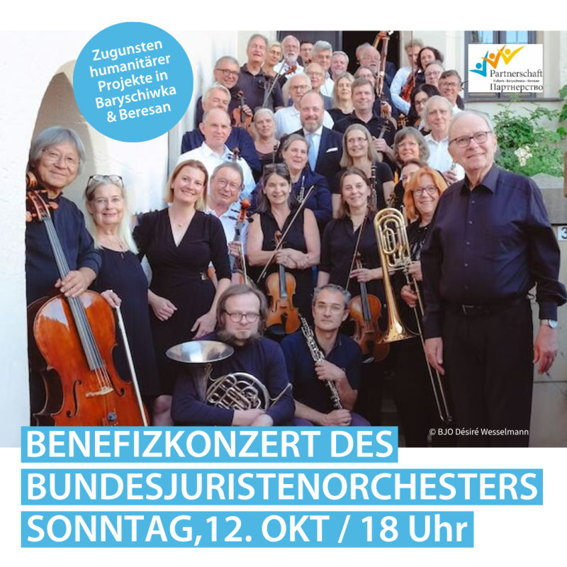 Benefizkonzert des Bundesjuristenorchesters zugunsten humanitärer Projekte in Baryschiwka & Beresan.Unter der Leitung von Georg Dücker präsentiert das Orchester Werke von Joseph Haydn, Georges Bizet, Max Bruch und Jean Sibelius. Solist ist Tadao Kataoka (Violoncello).Eintritt: 25 Euro, ermäßigt 15 Euro. Der gesamte Erlös des Konzerts geht zugunsten humanitärer Projekte an unsere ukrainischen Partnerstädte.