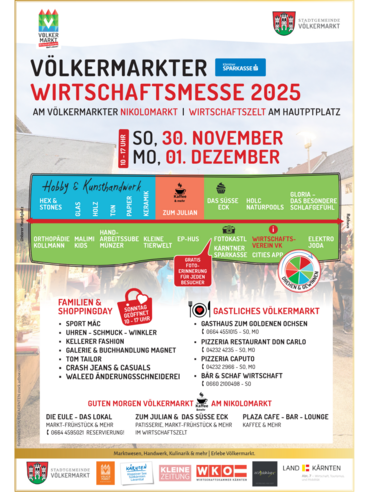 Die Völkermarkter Wirtschaftsmesse 2025 findet im Rahmen des traditionellen Völkermarkter Nikolomarktes statt und lädt zum Besuch ins Wirtschaftszelt am Hauptplatz in Völkermarkt ein. Die Messe bietet ein abwechslungsreiches Programm mit Hobby- und Kunsthandwerk, kulinarischen Genüssen und spannenden Präsentationen regionaler Betriebe. Besucherinnen und Besucher können handgefertigte Produkte aus Glas, Holz, Ton, Papier und Keramik bestaunen, aber auch besondere Angebote rund um Naturpools, Schlafkomfort oder Tierbedarf entdecken.