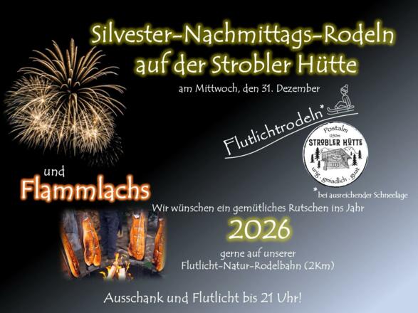 Silvester-Nachmittags-Rodeln und Flammlachs auf der Strobler Hütte ab 16:00 Uhr. www.stroblerhuette.at / Tel.: + 43 664 254 2237. Die Hütte schließt um 21:00 Uhr! Das Flutlichtrodeln ist nur bei ausreichender Schneelage möglich!