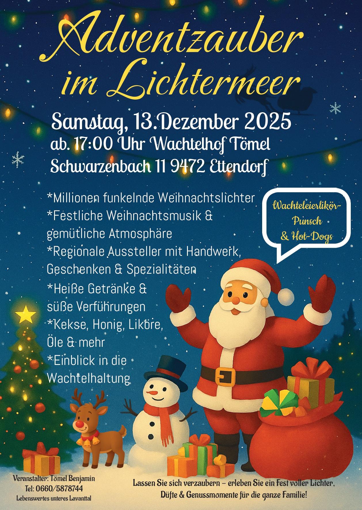Am Samstag, 13. Dezember ab 17:00 Uhr verwandelt sich der Wachtelhof Tömel in Schwarzenbach (9472 Ettendorf) in ein festlich glänzendes Lichtermeer.