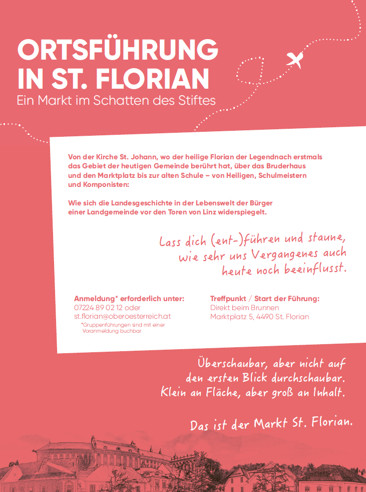 Von der Kirche St. Johann, wo der heilige Florian der Legende nach erstmals das Gebiet der heutigen Gemeinde berührt hat, über das Bruderhaus und den Marktplatz bis zur alten Schule – von Heiligen, Schulmeistern und Komponisten: Wie sich die Landesgeschichte in der Lebenswelt der Bürger einer Landgemeinde vor den Toren von Linz widerspiegelt.