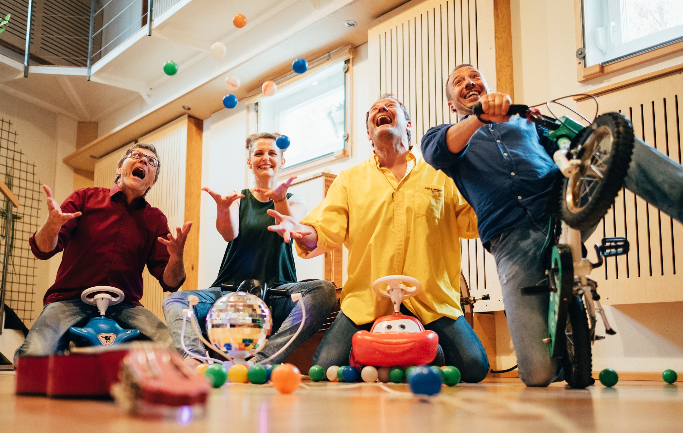 Die KINDER SOUND KISTN bringt ganz viel Sound und Bewegung mit: Der Flo spielt Gitarre und Trommel, der Didi, der zupft den Bass, die Babsi, die tanzt und springt und der Jacky schnippt und singt! Die KINDER SOUND KISTN musiziert, singt, tanzt, hüpft, rappt, pfeift, jodelt, rasselt, klatscht, erratet Lieder und blödelt ganz viel mit den Kindern!