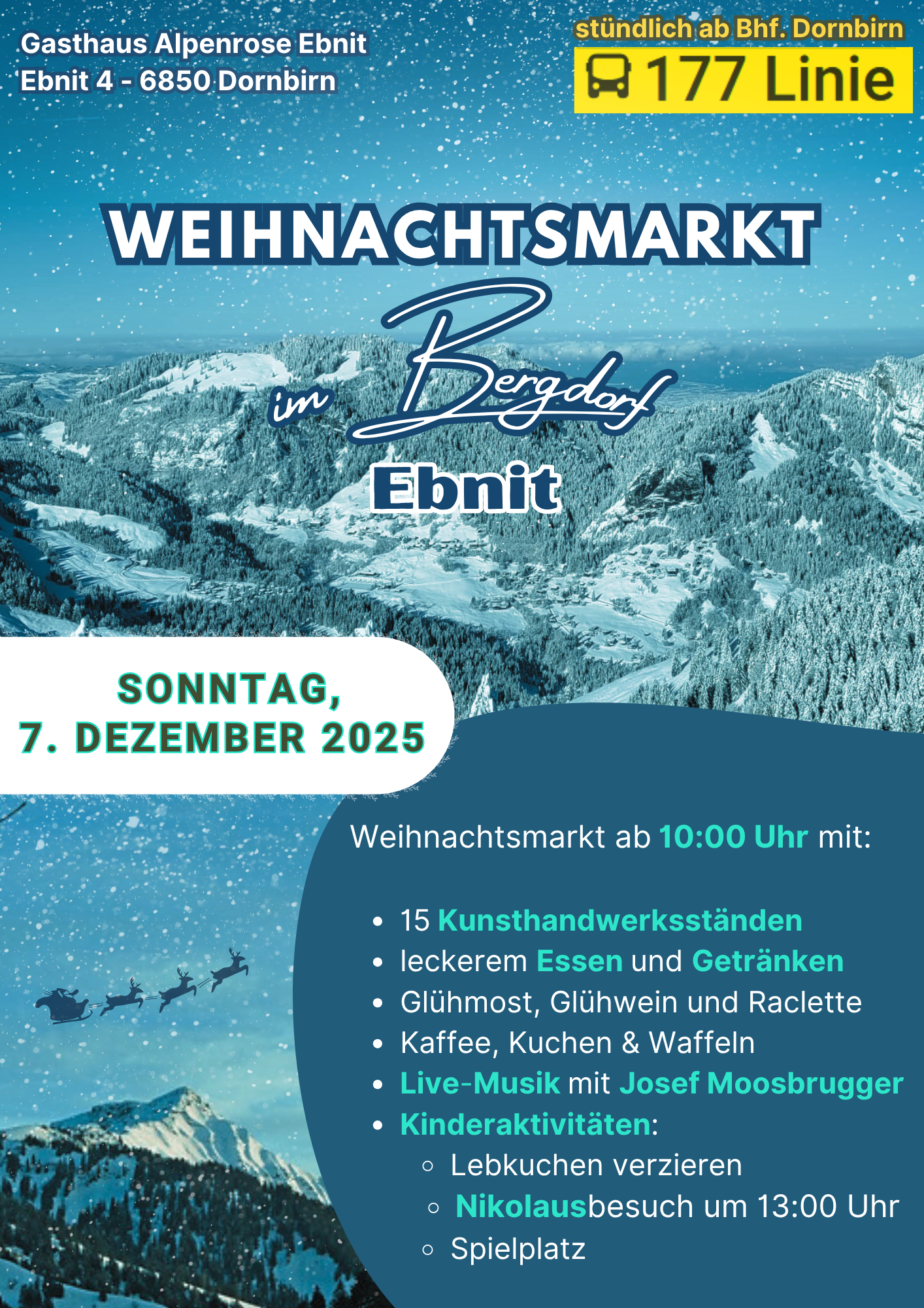 Der Weihnachtsmarkt beginnt um 10:00 Uhr im Gasthaus Alpenrose Ebnit. Es erwarten die Besucher unter anderem 15 Kunsthandwerksstände, regionale Speisen und Getränke, Live-Musik sowie verschiedene Kinderaktivitäten. Besonders erwähnenswert ist der Nikolausbesuch um 13:00 Uhr, bei dem die Kinder ein kleines Säckle bekommen.