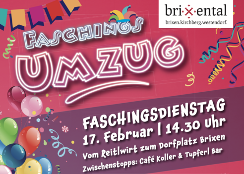 Angeführt und musikalisch begleitet wird der Umzug von der Musikkapelle Brixen, die mit ihren schwungvollen Klängen für beste Stimmung sorgt. Vom Reitlwirt aus ziehen wir bunt kostümiert durch den Ort bis zum Dorfplatz. Auf dem Weg machen wir Zwischenstopps beim Café Koller und beim Tupferl – gute Laune garantiert!