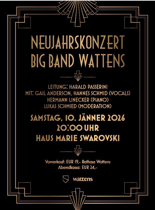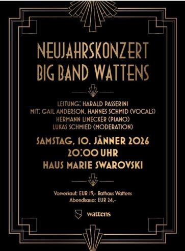 Die Big Band Wattens bestreitet das Neujahrskonzert unter der Leitung von Harald Passerini gemeinsam mit den special guests Gail Anderson und Hannes Schmid, vocals sowie Hermann Linecker, piano. Moderation: Bürgermeister Lukas Schmied. Freuen Sie sich auf einen schwungvollen Abend mit mitreißender Musik! Karten gibt es ab Dezember im Museum Wattens.