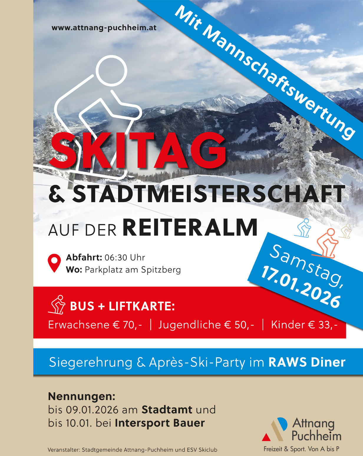 Anmeldungen für den Schitag sind entweder bis 9. Jänner 2026 an Stadtamt Attnang-Puchheim (bei Herr Mühlegger - Kultur) oder bis 10. Jänner 2026 direkt beim Intersport Bauer möglich.