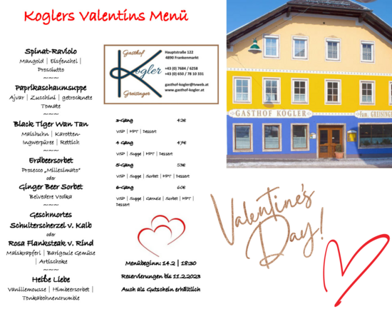 Am 14.02.26 laden wir Sie im Gasthaus Kogler & Greisinger in Frankenmarkt zu einem 6-gängigen Romantikmenü ein. Genießen Sie einen stimmungsvollen Valentinstag in gemütlicher Atmosphäre und lassen Sie sich kulinarisch verwöhnen.