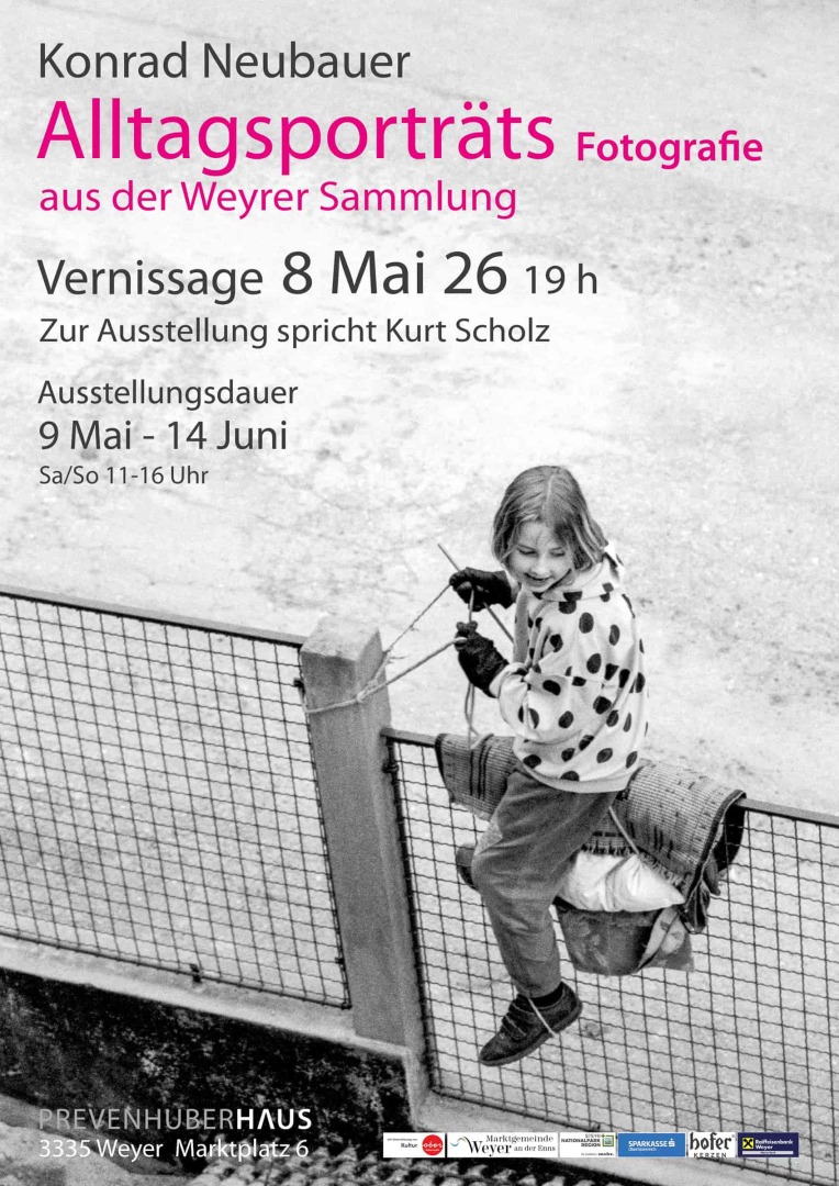 Konrad Neubauer zeigt in der Galerie im Prevenhuberhaus eine Auswahl von Alltagsporträts aus den Jahren 1975 bis 1995. Im Mittelpunkt steht die dörfliche Lebensgemeinschaft. Jene Menschen werden in den Fokus gerückt, die ihren Lebensraum prägen – durch Arbeit, Rituale, Begegnungen und alltägliche Handlungen. In der Auswahl seiner Motive setzt Neubauer bewusst identitätsstiftende Akzente: Gesten, Orte und Situationen werden zu Symbolen kollektiver Erinnerung und gemeinsamer Zugehörigkeit.