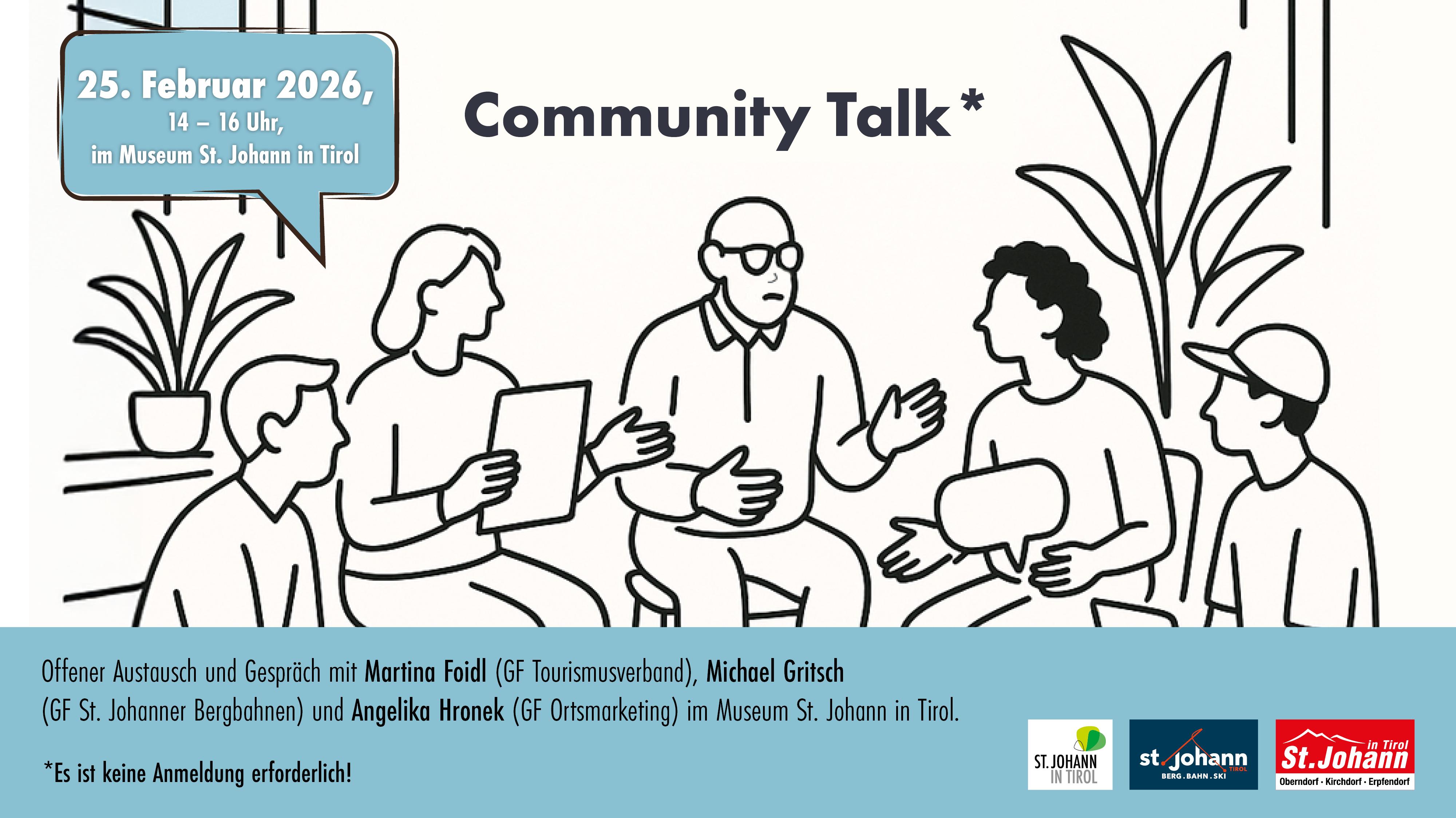 Am 25. Februar findet ein offener Austausch und Gespräch mit Martina Foidl (GF Tourismusverband), Michael Gritsch (GF St. Johanner Bergbahnen) und Angelika Hronek (GF Ortsmarketing) im Museum St. Johann in Tirol statt. Es ist keine Anmeldung erforderlich!