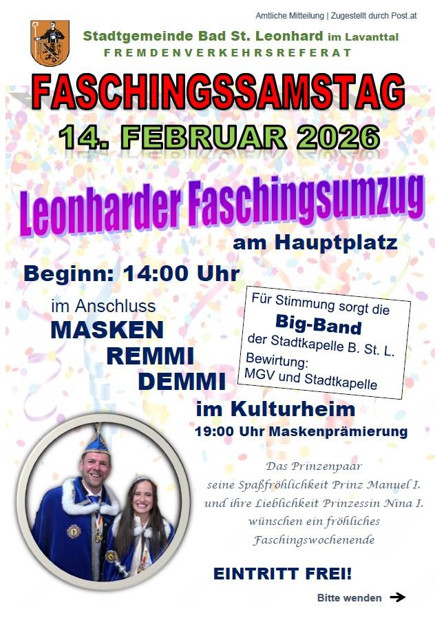 Im Anschluss findet im Kulturheim ein großes Masken-Remmi-Demmi mit der BigBand der Stadtkapelle Bad St. Leonhard und dem MGV Bad St. Leonhard statt.
