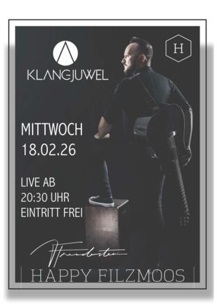 Freuen Sie sich auf einen musikalischen Abend in besonderem Ambiente: Am 18. Februar 2026 tritt die Band Klangjuwel in der Alpin Bar 87 im Happy Filzmoos auf. Ab 20:30 Uhr begeistert die Band mit Live-Musik und schafft eine mitreißende Stimmung, die zum Genießen und Verweilen einlädt. Ideal für einen entspannten Abend mit Freunden, guter Musik und bester Atmosphäre.