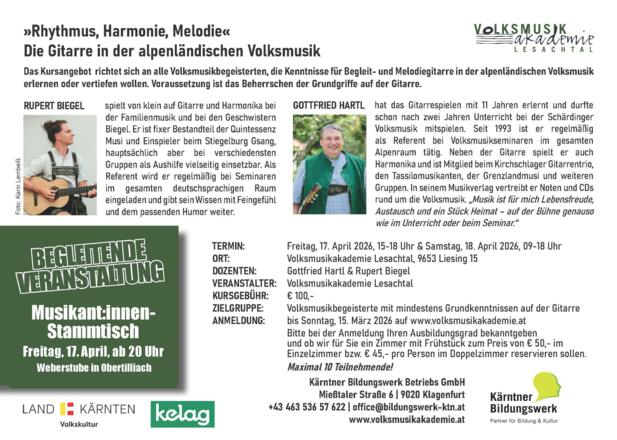 Das Kursangebot richtet sich an alle Volksmusikbegeisterten, die Kenntnisse für Begleit- und Melodiegitarre in der alpenländischen Volksmusik erlernen oder vertiefen wollen. Voraussetzung ist das Beherrschen der Grundgriffe auf der Gitarre.
