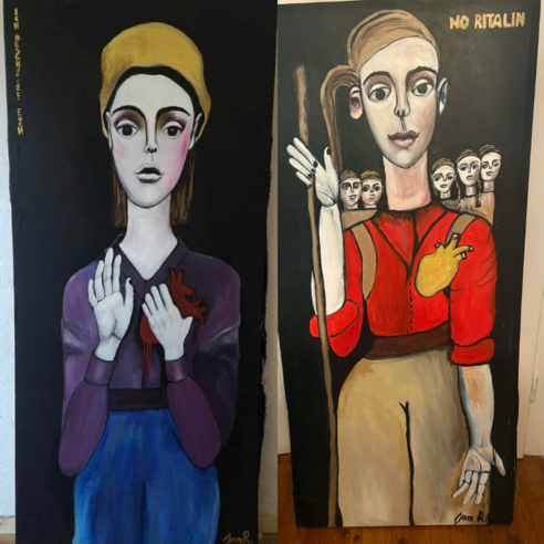 Ihre starken, farbgewaltigen Arbeiten stellen einen gemalten inneren Monolog dar, welcher unaufhörlich in der Kontinuität ihres Schaffens ihre Rolle als Selbst im Zusammenhang mit der Außenwelt portraitiert. Ina Rieglers Selbstportraits schaffen so eine Verbindung innerer Rollenbilder mit äußeren gesellschaftlichen Faktoren.