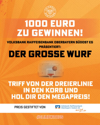 Achtung: Im Gewinnspiel "Der große Wurf" powered by Volksbank-Raiffeisenbank Oberbayern Südost eG kannst du mit einem Treffer von der Drei-Punkte-Linie 1000 Euro gewinnen! Zu jeder Eintrittskarte gibt es ein Gratis-Los dazu. Drei Personen werden ausgelost und dürfen je zweimal auf den Korb werfen – wer zuerst trifft, kassiert die 1000 Euro! (Teilnahme ab 18 Jahre, Aktive und Funktionäre des TVTsind von der Teilnahme ausgeschlossen)