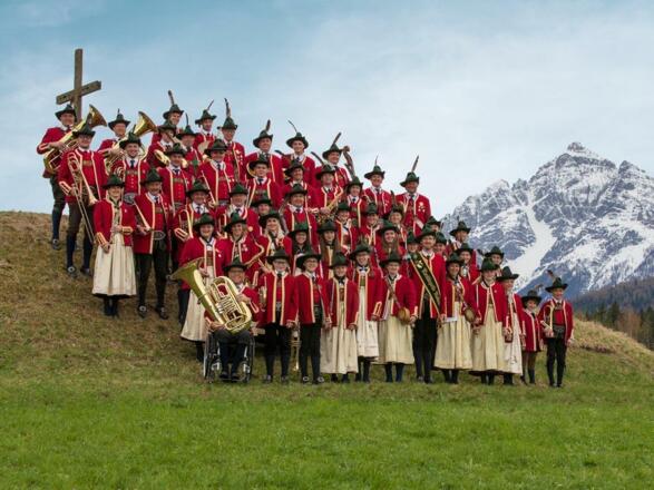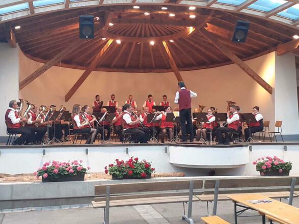 Die örtliche Musikkapelle führt durch einen abwechslungsreichen, musikalischen Abend im überdachten Pavillon im Zentrum von Mutters.