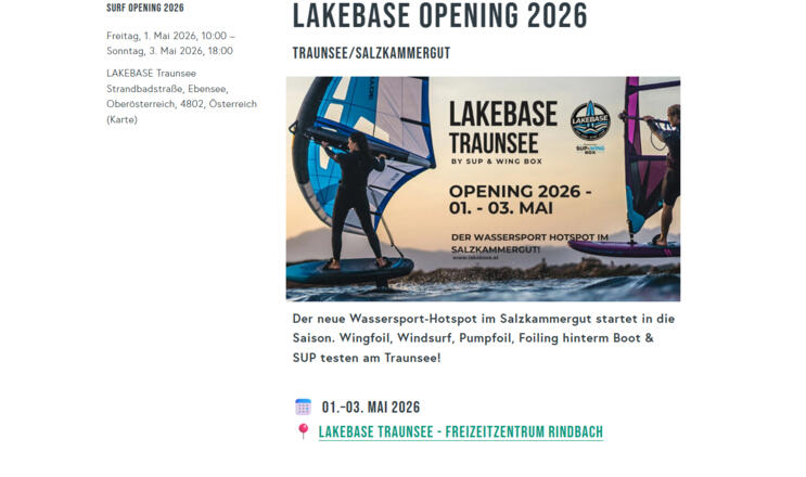 Von 1. bis 3. Mai 2026 eröffnet in Rindbach bei Ebensee die Lakebase Traunsee – ein Treffpunkt (neu übernommen) für alle, die Wasser, Wind und Bewegung lieben. Drei Tage lang wird getestet, ausprobiert, gelernt und gefeiert. Wer Wassersport einmal anders erleben möchte, ist hier genau richtig.