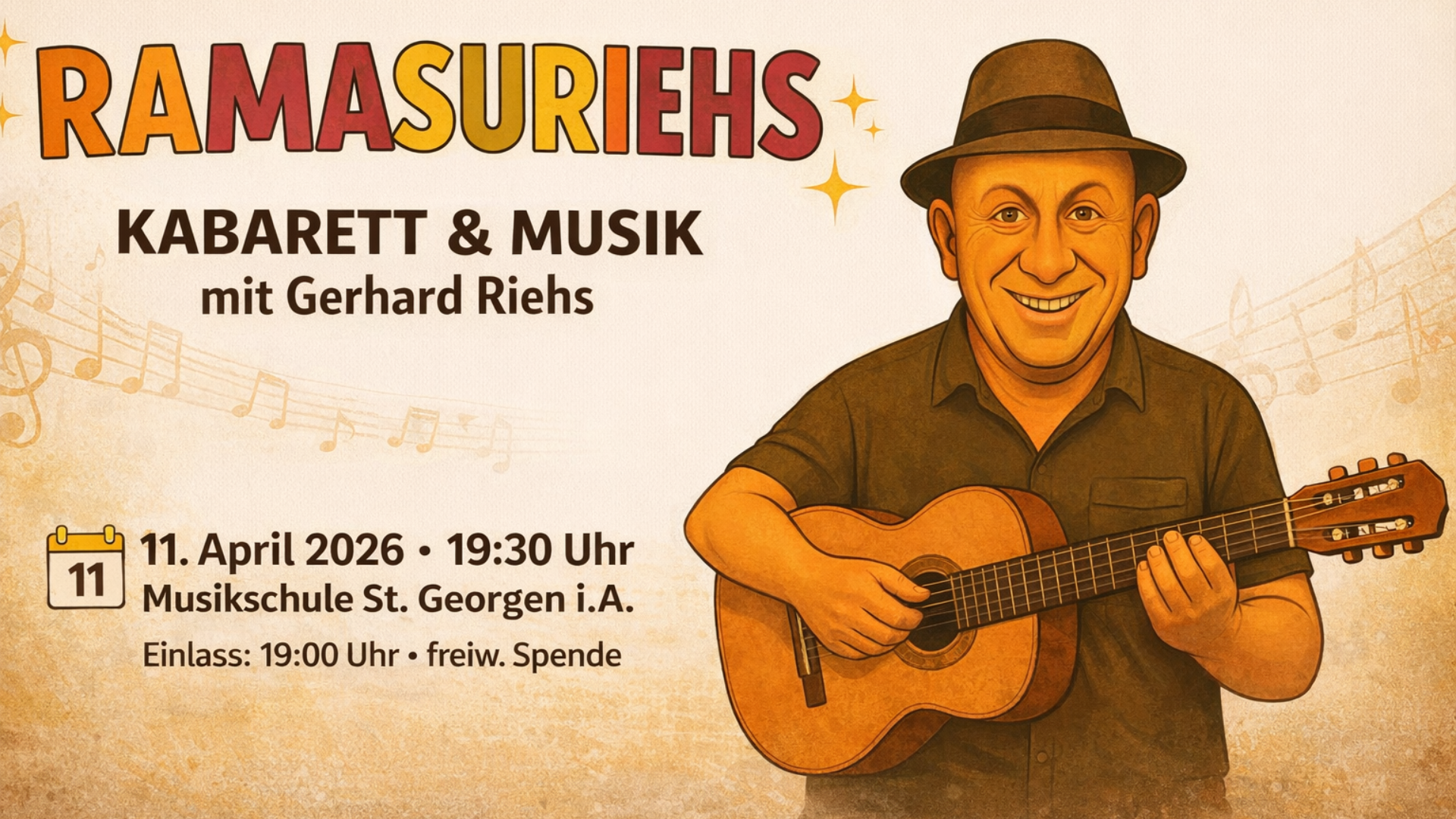 Freuen Sie sich auf einen unterhaltsamen Abend voller Humor, Musik und pointierter Geschichten. Mit seinem Programm „Ramasuriehs“ bringt Gerhard Riehs das Publikum zum Lachen und sorgt gleichzeitig für musikalische Highlights.