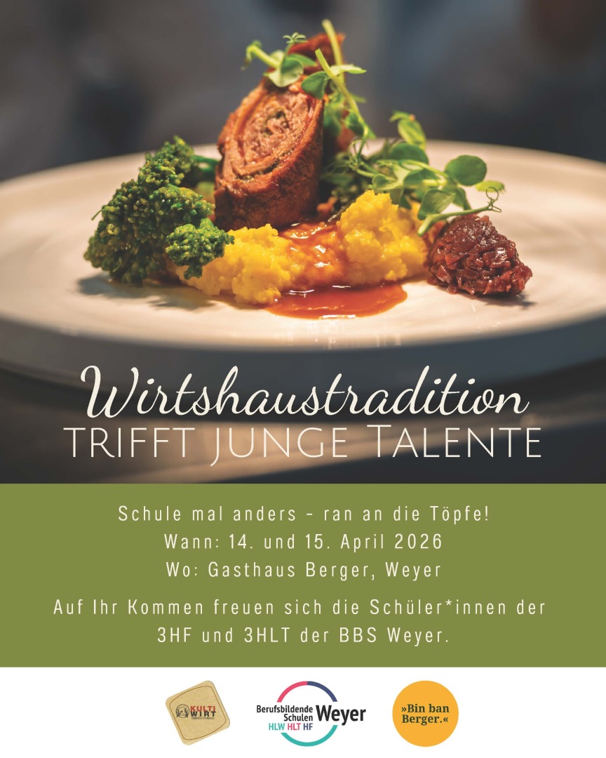 Die BBS Weyer und die Schülerinnen und Schülern der 3HF und 3HLT laden herzlich zu einem ganz besonderen Abend einladen, denn am 14. und 15. April heißt es "Schule mal anders - ran an die Töpfe!", wenn Wirtshaustradition auf junge Gastrotalente trifft.